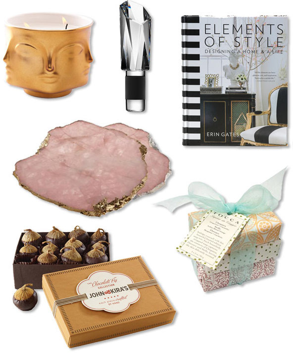 For your next holiday soiree, pick up something sweet (drunken chocolate figs), something fragrant (Tocca soaps), or something sparkly (a crystal wine stopper) for the host. Have a family member whose door is revolving during the holidays? A gilded quartz serving platter will make her hors d'oeuvres table shine. And design types will love Erin Gates' stunning coffee table book or Jonathan Adler's Muse candle.